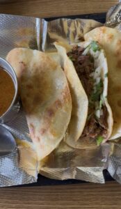 The menu was quite diverse. Mason Boland told me to get the Tori-Taco. This consisted of melted mozzarella cheese and beef. The tortilla is dipped in special birria sauce. With a side of consome. Alongside onions and cilantro.